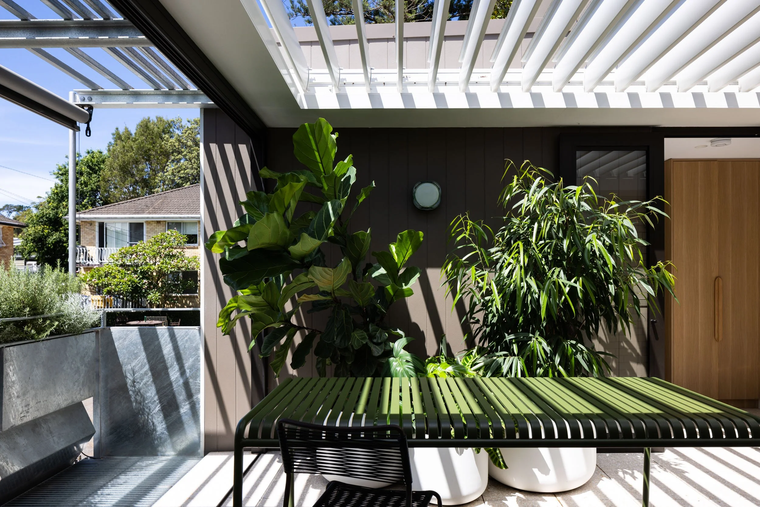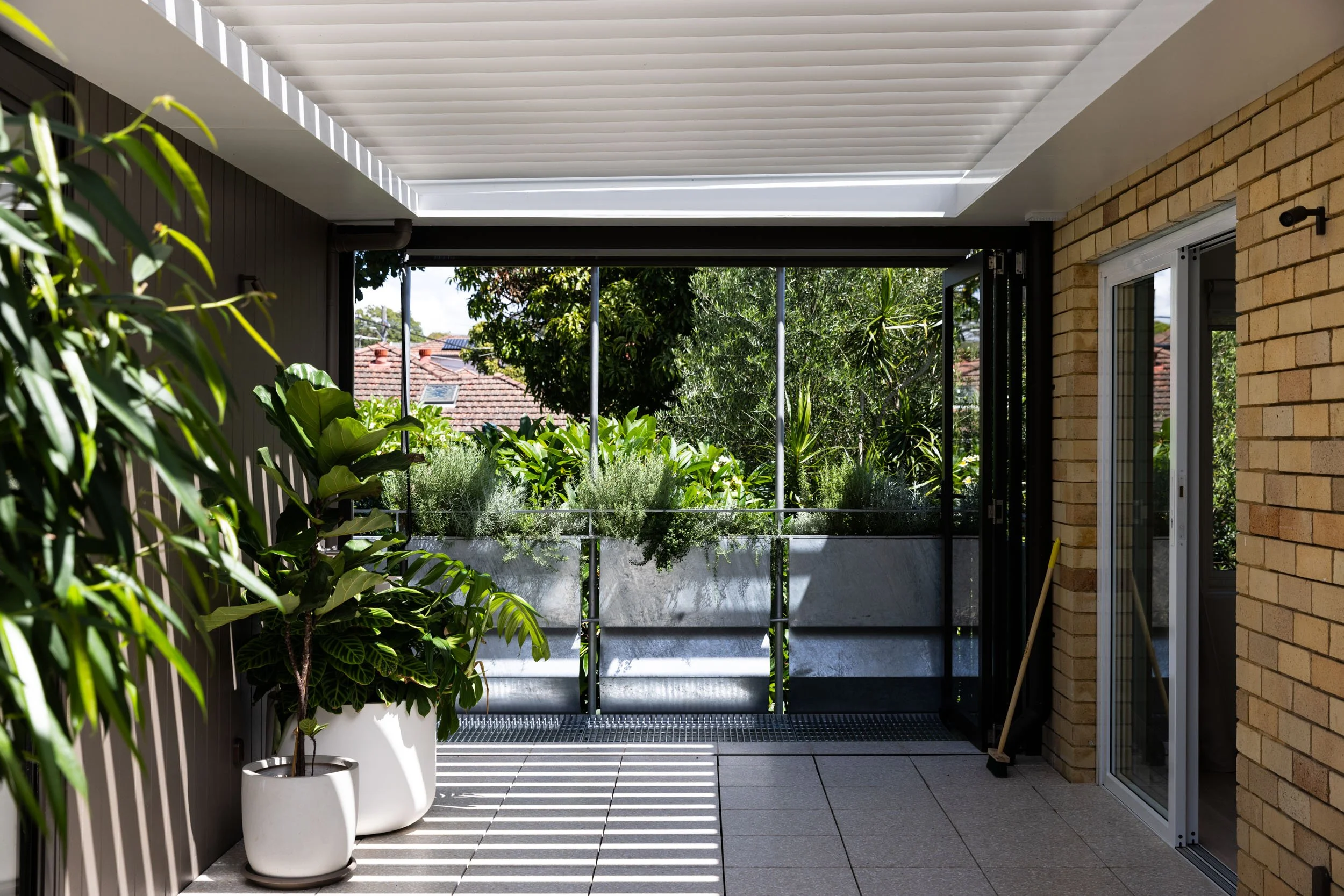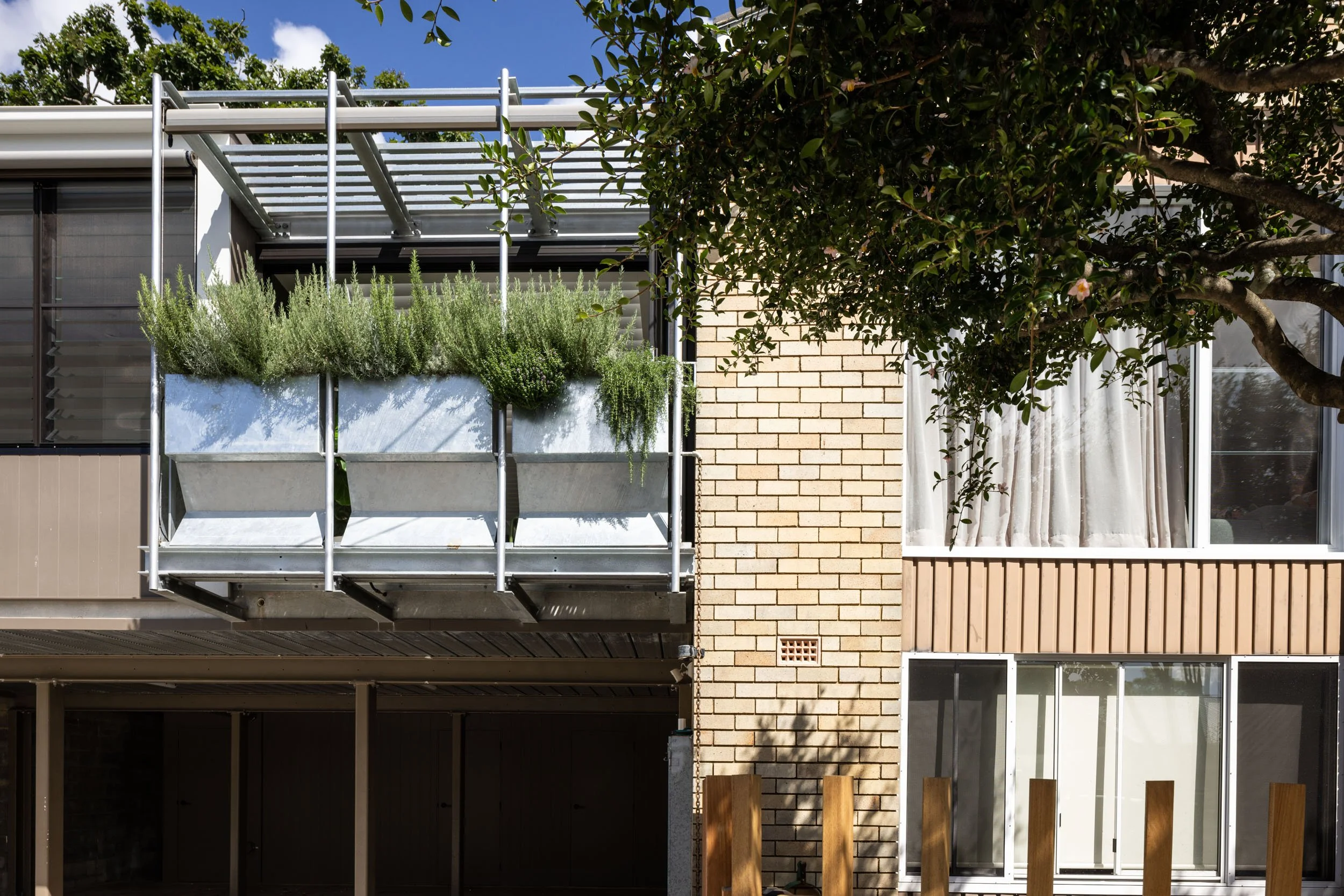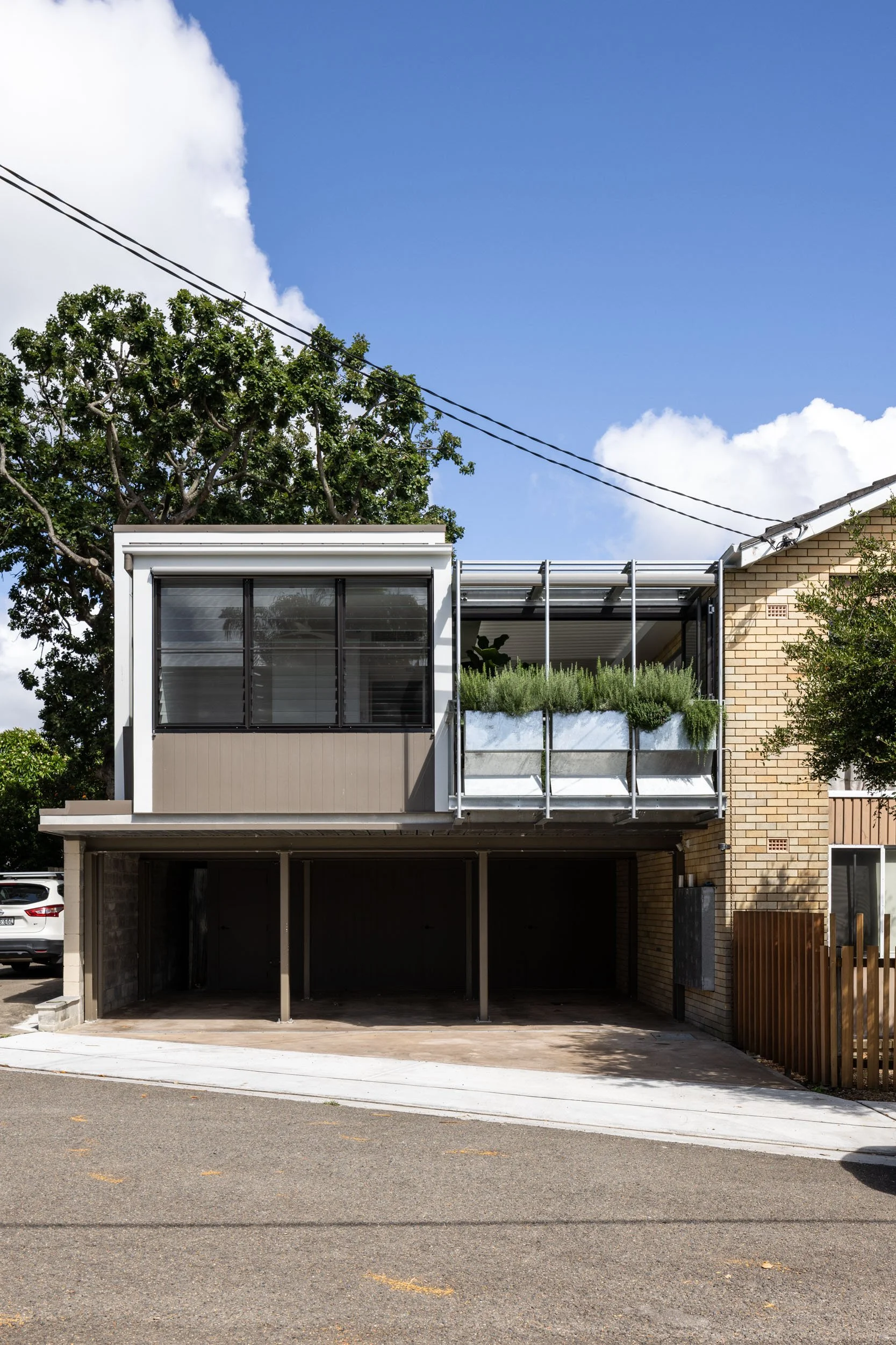 Taking advantage of a corner block lot, the extension of one unit to an existing block of 4 creates space where it’s unexpected. The new extensions above an existing carport, articulates around a “green heart”: an open covered terrace which acts as the lung and regulates the weather in summer and winter. All the rooms open onto this versatile open space and benefit from cross ventilation and controlled light. A series of integrated planters into balustrade creates privacy and frame views while addressing the street in a sustainable manner. A refreshing change and modern innovation for a suburban space.